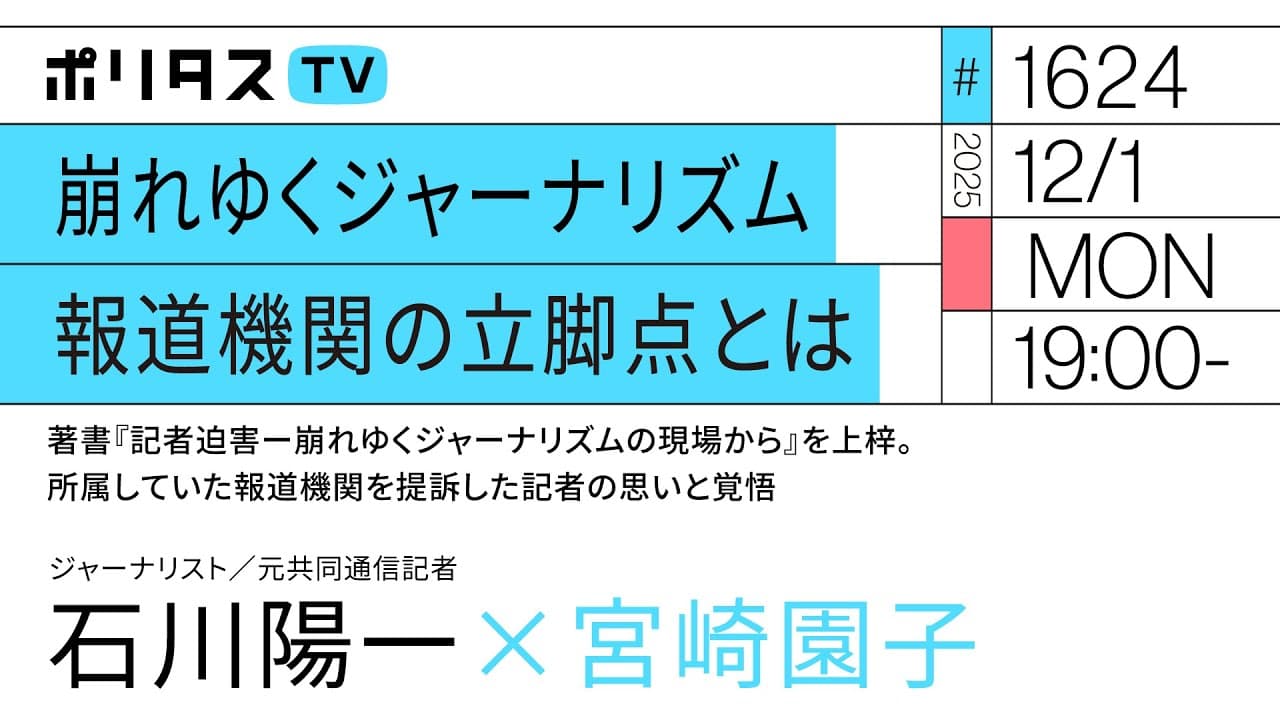 YouTubeで開く『記者迫害ー崩れゆくジャーナリズムの現場から』(石川陽一 花伝社、2025) https://www.amazon.co.jp/dp/4763421956 https://www.kadensha.net/book/b10146447.html 【ポリタスTV 12/1】 1️⃣著書『記者迫害』が話題 2️⃣「ムラ社会」化した現場・職場 3️⃣記者が報道の自由を問う 崩れゆくジャーナリズム 報道機関の立脚点とは|著書『記者迫害ー崩れゆくジャーナリズムの現場から』を上梓所属していた報道機関を提訴した記者の思いと覚悟。 ジャーナリストの石川陽一さんに、宮崎園子@sonoko_miyazakiが伺います。19時から配信。 【出演】 宮崎園子(MC / フリーランス記者) 石川陽一(ジャーナリスト/元共同通信記者) 『いじめの聖域 キリスト教学校の闇に挑んだ両親の全記録』(石川陽一 文藝春秋、2022) https://books.bunshun.jp/ud/book/num/9784163916224 https://www.amazon.co.jp/dp/4163916229 Tansa報道(全52回:更新中)「保身の代償 ~長崎高2いじめ自殺と大人たち~」 https://tansajp.org/investigativejournal_category/hoshin/ 【マンスリーサポーターページ】Tansa報道 https://tansajp.org/support/ ==================== ポリタスTVの番組は一週間後の19時まで見逃し配信、それ以降は下記の有料アーカイブサービスにてご視聴ください。1500本以上の過去配信番組(一部ライブ配信番組を除く)がご覧いただけます! 【ポリタスTVのメンバーシップ加入はコチラから】 👉 https://youtube.com/PolitasTV/join 【ポリタスTV】(日本時間)午後7時より配信中! 多士済々のMC陣が、その時々の時事問題や社会問題、メディア、テクノロジー、文化や芸術などのテーマを解説・深掘りします。