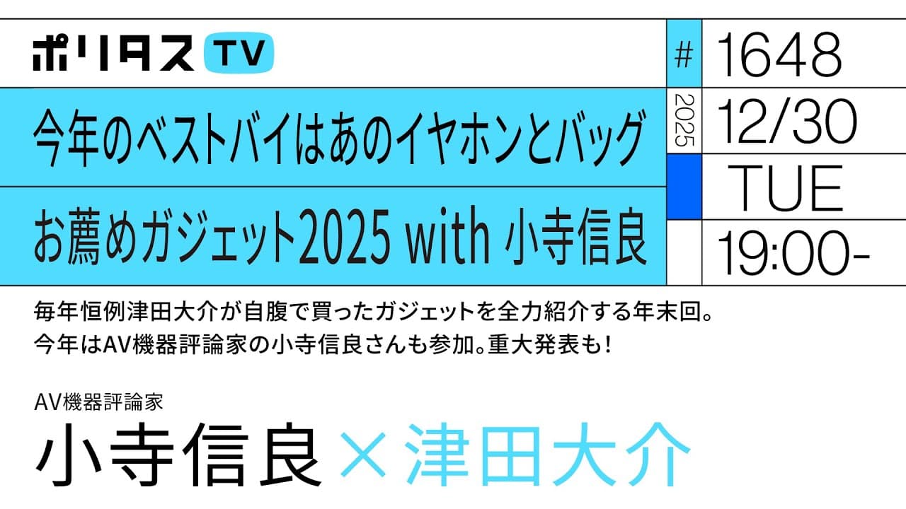 【ポリタスTVのメンバーシップ加入はコチラから】 👉 https://youtube.com/PolitasTV/join 【ポリタスTV 12/30】 1️⃣今年のベストバイはあのイヤホンとバッグ 2️⃣お薦めガジェット2025 with 小寺信良 3️⃣2025年に津田大介が自腹で買ったガジェットたちの振り返り 毎年恒例津田大介が自腹で買ったガジェットを全力紹介する年末回。今年はAV機器評論家の小寺信良さんも参加。 テンション高めでお送りします! #ポリタスTV 【出演】 津田大介(MC) 小寺信良(AV機器評論家) 【番組内で紹介したモノ】 ■津田大介 ・VAIO Vision+ 14 ・LG gram +View 17 ・VAIO Vision+® 14専用カバースタンド(新型) ・MOFT 非粘着多機能スタンド ・Apple AirPods Pro 3 ・Able Carry Max EDC ・コクヨ ツールペンスタンド〈ハコビズ〉 ・コクヨ ハコビズ2G ・エムプラン ブックカバー キュービックス ラウンドジップN A5判サイズ ブラック ・エムプラン ブックカバー キュービックス ラウンドジップN 四六判サイズ ブラック ・エムプラン ブックカバー キュービックス ラウンドジップN 新書判サイズ ブラック ・Anker Charger (140W, 4 Ports) with USB-C & USB-C ケーブル ダークグレー ・Anker Prime Charger(160W, 3 Ports) ・UGREEN Nexode Pro 薄型急速充電器 65W GaN 2C1A 3ポート ・UGREEN Nexode Pro 65W GaN 急速充電器 ・UGREEN DigiNest Pro 100W ・CIO NovaWave 3Way+ ・Anker Power Bank (25000mAh, Built-In & 巻取り式USB-Cケーブル) ・UGREEN Nexode 巻き取り式 USB-Cケーブル 100W ・Ezo Flex USB-C to USB-C 短いケーブル 13.5cm ・CIO カラビナ付きケーブルホルダー ・Lasocy ケーブルバンド 75mm ・Lasocy ケーブルバンド 106mm ・Lasocy ケーブルバンド 180mm ・BitTradeOne USB Cable Checker3 ・富士ソフト +F FS050W ・Ulanzi ZERO F38 ・Ulanzi U-190 ・Kaitezenz Goproカメラ用自撮り棒三脚 ・Hollyland VenusLiv V2 ・パナソニック DMC-FZH1 ・YoloLiv YoloBox Ultra ・DJI MIC 3 ・ESR OmniLock Qi2.2認証 25W充電 magsafe 車載ホルダー ・JESIMAIK CarPlay Ai Box ・Anker Nano Car Charger (75W, 巻取り式 USB-Cケーブル) ・RayCue New MagSafe Magnetic Folding Stand | Portable Desktop & Car Multi-Purpose Stand ・ヒツジのいらない尻枕 ・テンピュール 背もたれクッション ・MAXI-COSI Mica 360 Pro ・TobenONE Truly 6-in-1 Wireless Transmitter and HDMI Receiver ・Edifier ES20 ・Bose SoundLink Micro Portable Speaker(第2世代) ・Bose QuietComfort Ultra Earbuds(第2世代) ・SOUNDPEATS GoFree2 ・Amazon Fire TV Stick 4K Max ・CIO 柔らかいスパイラルシリコンケーブル HDMI to HDMI 2m ・MX MASTER 4 ・Velbon Coleman セルフィーマルチスタンド ・Galaxy S25 Ultra ・Vacbird 衣類圧縮袋ポンプセット ・Shark EVOPOWER SYSTEM BOOST+ LC701JBK ・cado STEM 500H ・PROTECA 360G4 ・株式会社太陽 キングゴリラシート ■小寺信良 ・CF-XZ6HFAQR(Panasonic)(動画で紹介した業務用ではないタイプ) ・OPT100 Neo Film(シンシア) ・リヒトラブ キーボードスタンド ブラック ・cheero Solido 10000mAh ※小寺さんによる紹介記事 https://www.itmedia.co.jp/news/articles/2512/11/news067.html ==================== 【ポリタスTV 2025年末 3夜連続プレミアムトーク】 DAY.1| 報道ヨミトキ2025総集編SP@ロフトプラスワン【#クレタス】 DAY.2| 「推し活」の"悪さ"と広告炎上から振り返る2025年 DAY.3| 「子育て」と「仕事/キャリア」の両立はなんでこんなにむずかしいのか? [チケット購入]👉 https://politastv.zaiko.io/item/377415 ※アーカイブ視聴期間:2026年1月12日(月)23時59分までアーカイブは視聴できます ==================== ポリタスTVの番組は一週間後の19時まで見逃し配信、それ以降は下記の有料アーカイブサービスにてご視聴ください。1500本以上の過去配信番組(一部ライブ配信番組を除く)がご覧いただけます! 【ポリタスTVのメンバーシップ加入はコチラから】 👉 https://youtube.com/PolitasTV/join 【ポリタスTV】(日本時間)午後7時より配信中! 多士済々のMC陣が、その時々の時事問題や社会問題、メディア、テクノロジー、文化や芸術などのテーマを解説・深掘りします。