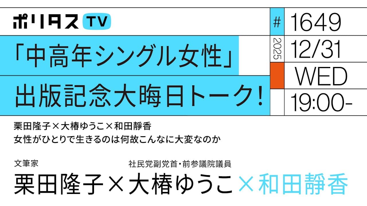 YouTubeで開く■『中高年シングル女性──ひとりで暮らすわたしたちのこと』(和田靜香/岩波新書) https://www.amazon.co.jp/dp/4004320933/tsudamag-22 https://www.iwanami.co.jp/book/b10153368.html 【ポリタスTV12/31】 1️⃣死ぬまで働かせる気か? 2️⃣住まいは人権だ! 3️⃣どう連帯してどう闘う? 「中高年シングル女性」出版記念大晦日トーク!栗田隆子×大椿ゆうこ×和田靜香 女性がひとりで生きるのは何故こんなに大変なのか。#ポリタスTV 【出演】 大椿ゆうこ(社民党副党首・前参議院議員) 栗田隆子(文筆家) 和田靜香(ライター) 【クラウドファンディング】 年末年始から通年へ。住まいを失う方へあたたかな一夜とワンストップ支援を届けたい! https://camp-fire.jp/projects/893162/view ●この1日を乗り切るための宿泊相談@トイミッケ 1月2日(金)(13時〜17時) 1月4日(日)(13時〜17時) 東京都豊島区池袋2-11-9 安藤ビル303号FRIENDS XV会議室 https://camp-fire.jp/projects/893162/view/activities/784780 ●反貧困 元旦 大人食堂 https://hanhinkonnetwork.org/archives/3437 日時:2026年1月1日 (木)13:00~17:00 場所:反貧困ネットワークサポートセンター(東京都新宿区西早稲田2-4-7東京DEW) 費用:無料・予約不要 ●「年末年始を生き抜くための炊き出し・相談会」わかちあい練馬 https://www.wakaneri.org/news/4898/ 日時:2026年1月1日(木曜日)11時30分から14時00分 場所:石神井公園駅北口ロータリー わかちあい練馬サポートセンター(練馬区石神井町2丁目15-15) ●名称: コシキチ(サンカクシャ) 対象: 15〜25歳くらいまでの若者 場所: 東京都豊島区上池袋4丁目35−12 3F(板橋駅から徒歩6分) 参加費: 無料(出入り自由、途中参加・途中退出OK) ・2025年12月31日〜2026年1月1日 14:00〜翌12:00 ・2026年1月2日・3日 14:00〜21:00 安全な場所、ご飯、イベント、相談を提供する。 その他全国での支援については厚生労働省の「年末年始の生活に関する支援活動のご案内」のページをご覧ください。 さらに電話相談では、電話相談(よりそいホットライン/フリーダイヤル 通話料無料) TEL:0120-279-338 TEL:0120-279-226(岩手、宮城、福島の3県からのみ) 年中無休・365日・ 24時間相談受付 もあります。 ==================== 【ポリタスTV 2025年末 3夜連続プレミアムトーク】 DAY.1| 報道ヨミトキ2025総集編SP@ロフトプラスワン【#クレタス】 DAY.2| 「推し活」の"悪さ"と広告炎上から振り返る2025年 DAY.3| 「子育て」と「仕事/キャリア」の両立はなんでこんなにむずかしいのか? [チケット購入]👉 https://politastv.zaiko.io/item/377415 ※アーカイブ視聴期間:2026年1月12日(月)23時59分までアーカイブは視聴できます ==================== ポリタスTVの番組は一週間後の19時まで見逃し配信、それ以降は下記の有料アーカイブサービスにてご視聴ください。1500本以上の過去配信番組(一部ライブ配信番組を除く)がご覧いただけます! 【ポリタスTVのメンバーシップ加入はコチラから】 👉 https://youtube.com/PolitasTV/join 【ポリタスTV】(日本時間)午後7時より配信中! 多士済々のMC陣が、その時々の時事問題や社会問題、メディア、テクノロジー、文化や芸術などのテーマを解説・深掘りします。