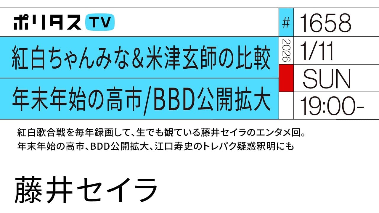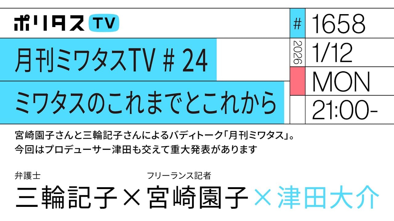 【ポリタスTV 1/12】 1️⃣月刊ミワタスTV # 24 2️⃣ミワタスのこれまでとこれから プロデューサー津田も交えて重大発表があります。 #ポリタスTV 【出演】 三輪記子(弁護士) 宮崎園子(フリーランス記者) 津田大介(ジャーナリスト/ポリタスTVキャスター) ==================== ポリタスTVの番組は一週間後の19時まで見逃し配信、それ以降は下記の有料アーカイブサービスにてご視聴ください。1500本以上の過去配信番組(一部ライブ配信番組を除く)がご覧いただけます! 【ポリタスTVのメンバーシップ加入はコチラから】 👉 https://youtube.com/PolitasTV/join 【ポリタスTV】(日本時間)午後7時より配信中! 多士済々のMC陣が、その時々の時事問題や社会問題、メディア、テクノロジー、文化や芸術などのテーマを解説・深掘りします。