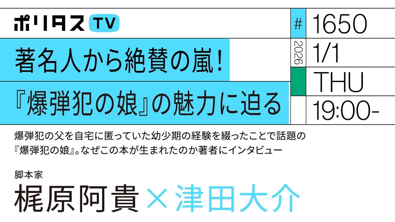 YouTubeで開く■『爆弾犯の娘』梶原阿貴(ブックマン社) https://www.amazon.co.jp/dp/4893089846/tsudamag-22 https://bookman.co.jp/book/b664042.html 【ポリタスTVのメンバーシップ加入はコチラから】 👉 https://youtube.com/PolitasTV/join 【ポリタスTV 1/1】 1️⃣著名人から絶賛の嵐! 2️⃣爆弾犯の父を自宅に匿っていた幼少期の経験を綴ったことで話題の『爆弾犯の娘』 3️⃣なぜこの本が生まれたのか著者にインタビュー 著者で脚本家の梶原阿貴さんに伺います。 #ポ リタスTV 【出演】 梶原阿貴(脚本家) 津田大介(ジャーナリスト/ポリタスTVキャスター) ==================== 【ポリタスTV 2025年末 3夜連続プレミアムトーク】 DAY.1| 報道ヨミトキ2025総集編SP@ロフトプラスワン【#クレタス】 DAY.2| 「推し活」の"悪さ"と広告炎上から振り返る2025年 DAY.3| 「子育て」と「仕事/キャリア」の両立はなんでこんなにむずかしいのか? [チケット購入]👉 https://politastv.zaiko.io/item/377415 ※アーカイブ視聴期間:2026年1月12日(月)23時59分までアーカイブは視聴できます ==================== ポリタスTVの番組は一週間後の19時まで見逃し配信、それ以降は下記の有料アーカイブサービスにてご視聴ください。1500本以上の過去配信番組(一部ライブ配信番組を除く)がご覧いただけます! 【ポリタスTVのメンバーシップ加入はコチラから】 👉 https://youtube.com/PolitasTV/join 【ポリタスTV】(日本時間)午後7時より配信中! 多士済々のMC陣が、その時々の時事問題や社会問題、メディア、テクノロジー、文化や芸術などのテーマを解説・深掘りします。