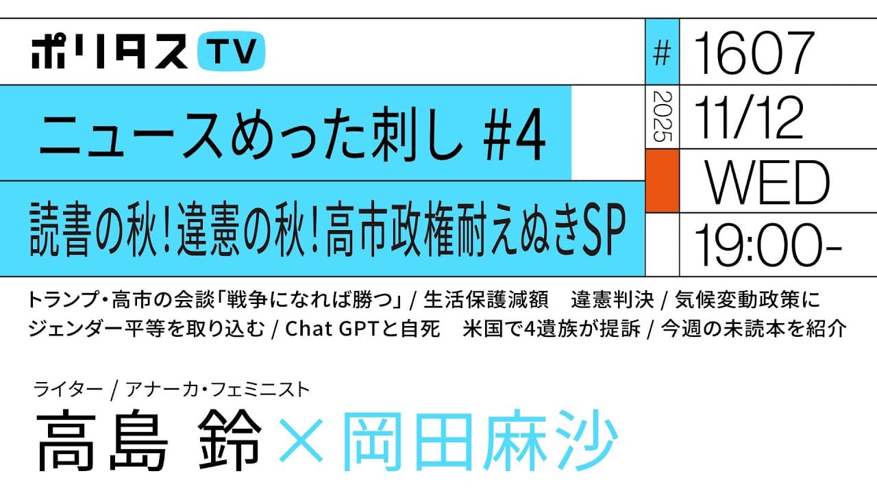 YouTubeで開く【会員限定】ニュースめった刺しゴールデン #4(11/12) 👉️ youtube.com/live/t5Ja9KHBbdg?feature=share 21時から会員限定の二部を配信いたします。 最後までご視聴したい方はぜひメンバーシップ登録をお願いします (下記リンクから会員登録できます) 👉 https://youtube.com/PolitasTV/join 【ポリタスTV 11/12】 1️⃣トランプ・高市の会談「戦争になれば勝つ」 2️⃣生活保護減額 違憲判決 3️⃣気候変動政策にジェンダー平等を取り込む 4️⃣Chat GPTと自死 米国で4遺族が提訴 5️⃣今週の未読本を紹介 岡田麻沙×高島鈴のニュースめった刺し#4 読書の秋!違憲の秋!高市政権耐えぬきSP #ポリタスTV 【出演者】 岡田麻沙(ライター / UXライター) 高島鈴(ライター / アナーカ・フェミニスト) ■『戦争とデザイン』著者に聞く|戦争と色・しるし・ことば|デザインが持つ「負」の側面に焦点を当て、戦争の歴史をひもとく。ナラティブ戦を支配し、人々を翻弄するダーク・デザインとは?|松田行正(3/16) https://www.youtube.com/watch?v=HProBFpAEMo&feature=youtu.be ■布団の中から蜂起せよ アナーカ・フェミニズムのための断章/高島鈴 https://www.amazon.co.jp/dp/4409241524 https://www.jimbunshoin.co.jp/book/b612114.html =========【今週の未読本】========= ・『福祉の世界史』編:金澤周作、帆刈浩之、松沢裕作、三浦徹 https://www.amazon.co.jp/dp/464117508X/ https://www.yuhikaku.co.jp/books/detail/9784641175082 ・『LGBTQ+の歴史』編:マイケル・ブロンスキー 訳:藤崎百合 監修:清水晶子 https://www.amazon.co.jp/dp/4309229654/ https://www.kawade.co.jp/np/isbn/9784309229652/ ・『「大東亜戦争」幻想化と「戦争責任」の精神史』小関素明 https://www.amazon.co.jp/dp/4409520970 https://www.jimbunshoin.co.jp/book/b10153397.html ・『障害者と歴史学』編:池田嘉郎、北村陽子 https://www.amazon.co.jp/dp/463452371X/ https://onlineshop.yamakawa.co.jp/product/52371 ・『江戸の刑事司法』和仁かや https://www.amazon.co.jp/dp/4480077189 https://www.chikumashobo.co.jp/product/9784480077189/ ・『「恥」に操られる私たち』著:キャシー・オニール 訳:西田美緒子 https://www.amazon.co.jp/dp/4826902743 https://www.hakuyo-sha.co.jp/psychology/shame/ ・『砂川闘争とは何か』高原太一 https://www.amazon.co.jp/dp/4588316249/ https://h-up.com/books/isbn978-4-588-31624-1.html ・『押し付けられる結婚 「官製婚活」とは何か』斉藤正美 https://www.amazon.co.jp/dp/4406069100/ https://www.shinnihon-net.co.jp/general/product/9784406069106 ・『クィアな時間と場所で』著:ジャック・ハルバスタム 訳:菅野優香、羽生有希、井上絵美子 https://www.amazon.co.jp/dp/4763422065/ https://www.kadensha.net/book/b10153044.html ・『人類学者が教える性の授業』奥野克巳 https://www.amazon.co.jp/dp/415340053X/ https://www.hayakawa-online.co.jp/shop/g/g0000240053/ ・『知の革命家たち』 http://www.suiseisha.net/blog/?page_id=12602 http://www.suiseisha.net/blog/?p=21795 ・『かたちと人類』松田行正 https://www.amazon.co.jp/dp/486528494X/ https://sayusha.com/books/-/isbn9784865284942 ・『たとえば「自由」はリバティか』渡辺浩 https://www.amazon.co.jp/dp/4000617265 https://www.iwanami.co.jp/book/b10146261.html ・『戦争と芸術の〈境界〉で語りをひらくー有田・大村・朝鮮と脱植民地化』著:山口祐香、チョン・ユギョン/Jong YuGyong https://www.amazon.co.jp/dp/4991248930/ https://hanatabasyobo.stores.jp/items/68cf5f0e01165df1470dd131 ・『ネクロポリティクス 死の政治学』著:アシル・ンベンベ 訳:岩崎稔、小田原琳 https://www.amazon.co.jp/dp/4409041290 https://www.jimbunshoin.co.jp/book/b10139560.html ・『枢軸 ベルリン・ローマ・東京 一九一九―一九四六年』著:ダニエル・ヘディンガー 監訳:清水雅大 訳:山本晶子、山根徹也 https://www.amazon.co.jp/dp/4409511092 https://www.jimbunshoin.co.jp/book/b10144732.html ・『ネット世論の見えない支配者』著:ルネ・ディレスタ 訳:岸川由美 https://www.amazon.co.jp/dp/4562075775 http://www.harashobo.co.jp/book/b668294.html ・『ミシェル・フーコーと狂気のゆくえ 我狂う、ゆえに我あり』中谷陽二 https://www.amazon.co.jp/dp/4065415810 https://www.kodansha.co.jp/book/products/0000420497 ・『感覚の植民地主義と言語のヘゲモニー』山下惠理 https://www.amazon.co.jp/dp/4326200693 https://www.keisoshobo.co.jp/book/b10151522.html ==================== ポリタスTVの番組は一週間後の19時まで見逃し配信、それ以降は下記の有料アーカイブサービスにてご視聴ください。1500本以上の過去配信番組(一部ライブ配信番組を除く)がご覧いただけます! 【ポリタスTVのメンバーシップ加入はコチラから】 👉 https://youtube.com/PolitasTV/join 【ポリタスTV】(日本時間)午後7時より配信中! 多士済々のMC陣が、その時々の時事問題や社会問題、メディア、テクノロジー、文化や芸術などのテーマを解説・深掘りします。