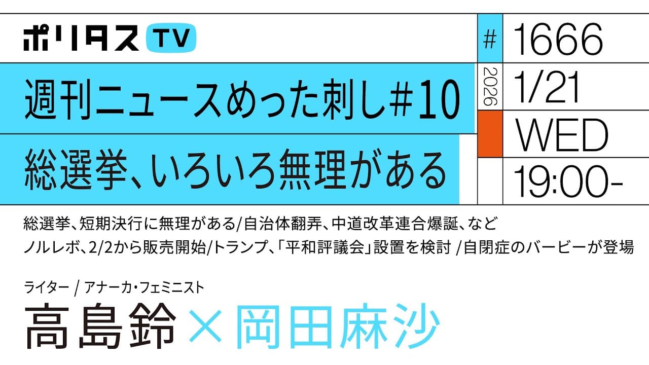 【会員限定】週刊ニュースめった刺し ゴールデン #10 岡田麻沙×高島鈴(1/21) 👉️ https://www.youtube.com/live/uAIuVTd_8Yo?si=YRtkpoXMPR3heFJY 会員限定の放送があります。ご視聴したい方はぜひメンバーシップ登録をお願いします (下記リンクから会員登録できます) 👉 https://youtube.com/PolitasTV/join 【ポリタスTV 1/21】 1️⃣総選挙、短期決行に無理がある🤯 2️⃣自治体翻弄、中道改革連合爆誕、など 3️⃣ノルレボ、2/2から販売開始 4️⃣トランプ、「平和評議会」設置を検討 5️⃣自閉症のバービーが登場 週刊ニュースめった刺し#10 総選挙、いろいろ無理がある。 ライターの岡田麻沙とライター / アナーカ・フェミニスト高島鈴で語り尽くします。#ポリタスTV 【出演者】 岡田麻沙(ライター / UXライター) 高島鈴(ライター / アナーカ・フェミニスト) ■今週の未読本 ・村上靖彦『現象学的質的研究入門 一人ひとりに固有の経験と向き合うために』 https://www.nakanishiya.co.jp/book/b10154374.html http://www.amazon.co.jp/exec/obidos/ASIN/4779519004/tsudamag-22 ・『本の雑誌 2月号』 https://www.webdoku.jp/honshi/2026/2-251226123600.html http://www.amazon.co.jp/exec/obidos/ASIN/4860115740/tsudamag-22 ・竹浪遠/山本堯 編『龍の美術史』 https://www.chukobi.co.jp/products/published/cat-14/3115480.html http://www.amazon.co.jp/exec/obidos/ASIN/4805510838/tsudamag-22 ・『ユリイカ2026年2月号 特集=大前粟生』 https://www.seidosha.co.jp/book/index.php?id=4102 http://www.amazon.co.jp/exec/obidos/ASIN/4791704738/tsudamag-22 ・ロイ ワグナー『それ自体を表す象徴』 https://www.ibunsha.co.jp/books/978475310398-0/ http://www.amazon.co.jp/exec/obidos/ASIN/4753103986/tsudamag-22 ■今週の既読本 ・金原瑞人『英米文学のわからない言葉』 https://sayusha.com/books/-/isbn9784865285055 http://www.amazon.co.jp/exec/obidos/ASIN/4865285059/tsudamag-22 ============================================ ポリタスTVの番組は一週間後の19時まで見逃し配信、それ以降は下記の有料アーカイブサービスにてご視聴ください。1000本以上の過去配信番組(一部ライブ配信番組を除く)がご覧いただけます! 【メンバーシップ加入はコチラから】 👉 https://youtube.com/PolitasTV/join 【ポリタスTV】毎日(日本時間)午後7時より配信中! 多士済々のMC陣が、その時々の時事問題や社会問題、メディア、テクノロジー、文化や芸術などのテーマを解説・深掘りします。