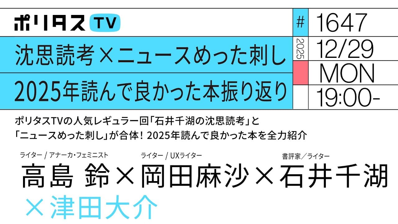 YouTubeで開く【会員限定】ニュースめった刺しゴールデン #7 岡田麻沙×高島鈴(12/24) 👉️ https://youtube.com/live/iAt7V3TZlb0?feature=share 会員限定の二部を配信いたします。 ご視聴したい方はぜひメンバーシップ登録をお願いします (下記リンクから会員登録できます) 👉 https://youtube.com/PolitasTV/join 【ポリタスTV 12/24】 1️⃣2025年ふりかえり 2️⃣排外主義の1年間 3️⃣山上徹也被告の裁判開始 4️⃣パレスチナ「停戦」の欺瞞 5️⃣AI解雇が約5.5万件 6️⃣今週は「未読本」はおやすみです ニュースめった刺し#7 今年も生き延びお疲れ様SP。ライターの岡田麻沙とライター / アナーカ・フェミニスト高島鈴で語り尽くします。#ポリタスTV 【出演者】 岡田麻沙(ライター / UXライター) 高島鈴(ライター / アナーカ・フェミニスト) 【ポリタスTV 2025年末 3夜連続プレミアムトーク】 DAY.1| 12.26 FRI 報道ヨミトキ2025総集編SP@ロフトプラスワン【#クレタス】 DAY.2| 12.27 SAT 「推し活」の"悪さ"と広告炎上から振り返る2025年 DAY.3| 12.28 SUN 「子育て」と「仕事/キャリア」の両立はなんでこんなにむずかしいのか? [チケット購入] 👉 https://politastv.zaiko.io/item/377415 ※アーカイブ視聴期間:2026年1月12日(月)23時59分までアーカイブは視聴できます 旅野そらYouTube https://www.youtube.com/@UC_aqfJwiavLQNMjURn-8mDg 報道ヨミトキFRIDAY #206 参院選直前特番|今日の報道ヨミトキFRIDAYは参院選直前特番。選挙の盛り上がりの影で不可視化される女性・ジェンダー政策や選挙のあり方を徹底的にチェック(7/18) https://www.youtube.com/live/kBF_ToJLSiY -------------------------------------------------------- DAY.1 ポリタスTV 報道ヨミトキ2025総集編SP@ロフトプラスワン [日時]12月26日(金)START 19:00 【出演】 青木理(ジャーナリスト),浜田敬子(ジャーナリスト) 宮崎園子(フリーランス記者) 三輪記子(弁護士) 岡田麻沙(ライター、UXライター) 高島鈴(ライター、アナーカ・フェミニスト) 辻田真佐憲(評論家、近現代史研究者) 瀧波ユカリ(漫画家) 北丸雄二(ジャーナリスト) 小川公代(上智大学外国語学部教授) 望月衣塑子(東京新聞記者) 大島育宙(XXCLUB) 津田大介(ジャーナリスト/ポリタスTVキャスター、司会) [配信URL]👉https://zaiko.io/event/377415/stream/183566/163827 -------------------------------------------------------- ●DAY.2 BONUS TRACK#1 「推し活」の"悪さ"と広告炎上から振り返る2025年【配信のみ】 [日時] 12月27日(土)START 19:00 - 【出演】 小林美香(ジェンダー表象研究家) 渡部宏樹(筑波大学人文社会系助教) 中村ホールデン梨華(AD-LAMP代表、広告炎上チェッカー) 町田彩夏(政治コメンテーター) 津田大介(ジャーナリスト/ポリタスTVキャスター、司会) [配信URL]👉 https://zaiko.io/event/377415/stream/183566/163828 -------------------------------------------------------- ●DAY.3 BONUS TRACK#2「子育て」と「仕事/キャリア」の両立はなんでこんなにむずかしいのか?【配信のみ】 [日時] 12月28日(日)START 19:00 - 【出演】 富永京子(立命館大学産業社会学部准教授) 武田俊輔(法政大学社会学部教授) 津田大介(ジャーナリスト/ポリタスTVキャスター、司会) [配信URL]👉 https://zaiko.io/event/377415/stream/183566/163829 【ポリタスTV 2025年末 3夜連続プレミアムトーク】 [チケット購入] 👉 https://politastv.zaiko.io/item/377415 ============================================ ポリタスTVの番組は一週間後の19時まで見逃し配信、それ以降は下記の有料アーカイブサービスにてご視聴ください。1000本以上の過去配信番組(一部ライブ配信番組を除く)がご覧いただけます! 【メンバーシップ加入はコチラから】 👉 https://youtube.com/PolitasTV/join 【ポリタスTV】毎日(日本時間)午後7時より配信中! 多士済々のMC陣が、その時々の時事問題や社会問題、メディア、テクノロジー、文化や芸術などのテーマを解説・深掘りします。