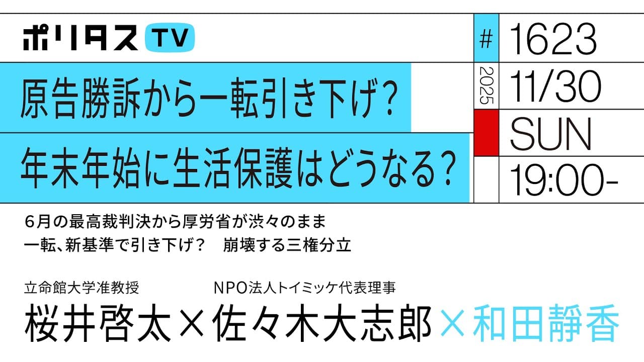 YouTubeで開く【クラウドファンディング:CAMPFIRE】 年末年始から通年へ。住まいを失う方へあたたかな一夜とワンストップ支援を届けたい!(特定非営利活動法人トイミッケ) https://camp-fire.jp/projects/893162/view 【ポリタスTV 11/30】 1️⃣いのちのとりで裁判は何だった? 2️⃣政治判断の減額改定? 3️⃣ 生活者たちの生活保護忌避? 立命館大学准教授の桜井啓太さん、NPO法人トイミッケ代表理事の佐々木大志郎さんに和田靜香が尋ねます #ポリタスTV 【出演】 桜井啓太(立命館大学産業社会学部准教授) 佐々木大志郎(NPO法人トイミッケ代表理事) 和田靜香(MC / ライター)@wadashizuka ==================== ポリタスTVの番組は一週間後の19時まで見逃し配信、それ以降は下記の有料アーカイブサービスにてご視聴ください。1500本以上の過去配信番組(一部ライブ配信番組を除く)がご覧いただけます! 【ポリタスTVのメンバーシップ加入はコチラから】 👉 https://youtube.com/PolitasTV/join 【ポリタスTV】(日本時間)午後7時より配信中! 多士済々のMC陣が、その時々の時事問題や社会問題、メディア、テクノロジー、文化や芸術などのテーマを解説・深掘りします。
