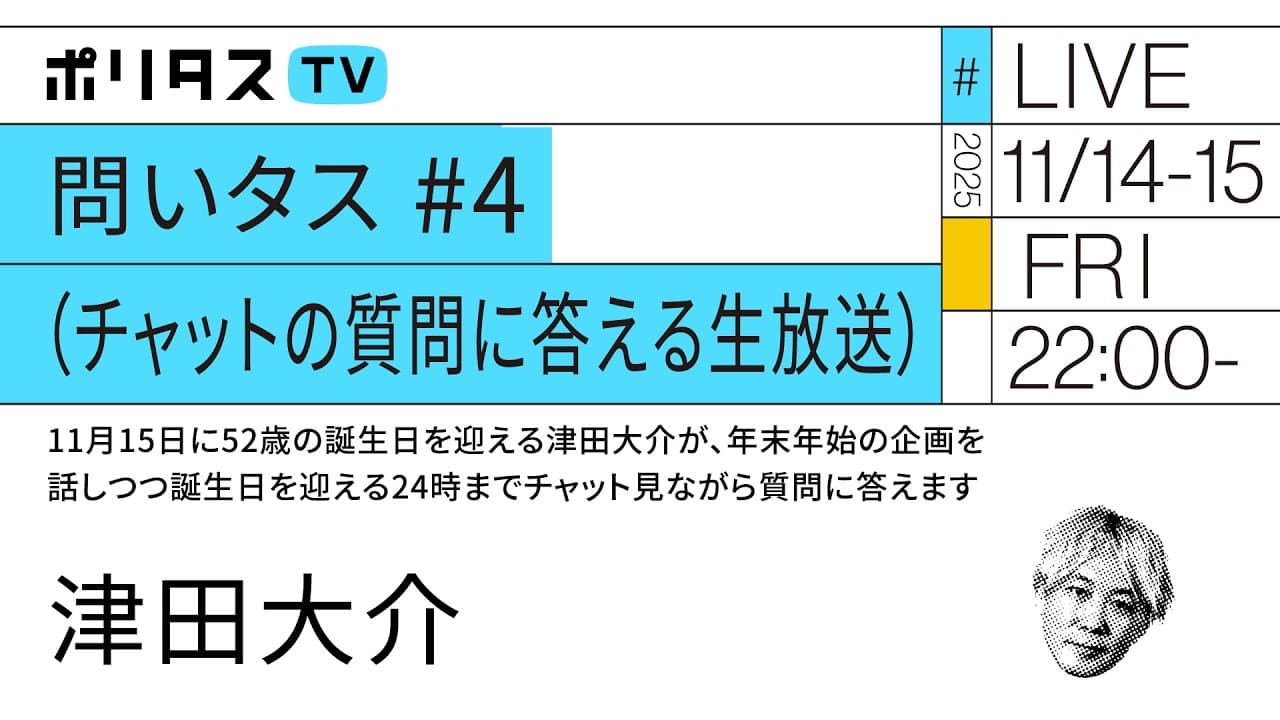 (ポリタスTV メンバーシップへの登録) 👉 https://youtube.com/PolitasTV/join 11月15日に52歳の誕生日を迎える津田大介が、年末年始の企画を話しつつ誕生日を迎える24時までチャット見ながら質問に答えます 【出演】 津田大介(MC / ポリタスTVキャスター) チャンネル メンバーの請求と支払いに関する情報 https://support.google.com/youtube/answer/14915707?sjid=4787076904672873567-NC#zippy=%2C%E3%83%A1%E3%83%B3%E3%83%90%E3%83%BC%E3%82%B7%E3%83%83%E3%83%97-%E3%83%AC%E3%83%99%E3%83%AB%E3%82%92%E5%A4%89%E6%9B%B4%E3%81%97%E3%81%9F%E3%83%81%E3%83%A3%E3%83%B3%E3%83%8D%E3%83%AB-%E3%83%A1%E3%83%B3%E3%83%90%E3%83%BC%E3%81%AE%E5%A0%B4%E5%90%88 ==================== ◆ ポリタスTV (有限会社ネオローグへの)ドネーション振込先 【銀行振込】 三井住友銀行 神田支店 普通 2027878 ユ)ネオローグ 【PayPal送金】 以下のリンクの送信ボタンからご送金ください。 https://PayPal.me/neologue