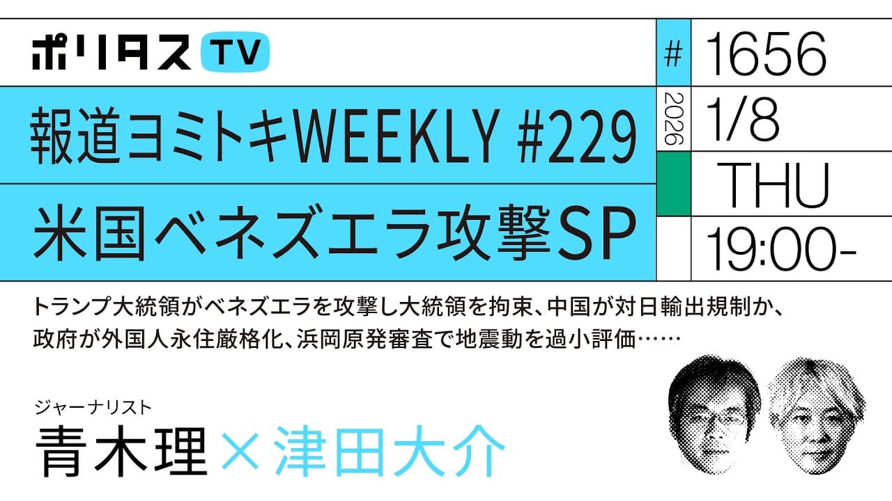【会員限定】報道ヨミトキWEEKLY #229 ゴールデン(1/8)#ポリタスTV 👉️ https://www.youtube.com/live/pgTgTNrtTr0?si=AaV4DI1F_kvVZeMb 会員限定の配信を視聴したい方はメンバーシップ登録をお願いします (下記リンクから会員登録できます) 👉 https://youtube.com/PolitasTV/join 【ポリタスTV 1/8】 1️⃣報道ヨミトキWEEKLY #229 米国ベネズエラ攻撃SP 2️⃣トランプ大統領がベネズエラを攻撃し大統領を拘束、中国が対日輸出規制か、政府が外国人永住厳格化、浜岡原発審査で地震動を過小評価…… ジャーナリストの青木理さんと1週間のニュースを振り返ります。 #ポリタスTV 【出演者】 青木理(ジャーナリスト) 津田大介(MC) ■青木理さん新刊『闇の奥』 https://www.amazon.co.jp/dp/430923173X/ https://www.kawade.co.jp/np/isbn/9784309231730/ ■予約:『百年の挽歌 原発、戦争、美しい村』(青木理) https://www.amazon.co.jp/dp/4087890244/ https://www.shueisha.co.jp/books/items/contents.html?isbn=978-4-08-789024-2 ■青木理 × 武田砂鉄「3.11から15年 わすれることの暴力性について」【「百年の挽歌原発、戦争、美しい村」(集英社)刊行記念】 1月26日(月)19:00~(開場:18:30) https://peatix.com/event/4767962 【ポリタスTV 2025年末 3夜連続プレミアムトーク】 DAY.1| 報道ヨミトキ2025総集編SP@ロフトプラスワン【#クレタス】 DAY.2| 「推し活」の"悪さ"と広告炎上から振り返る2025年 DAY.3| 「子育て」と「仕事/キャリア」の両立はなんでこんなにむずかしいのか? [チケット購入]👉 https://politastv.zaiko.io/item/377415 ※アーカイブ視聴期間:2026年1月12日(月)23時59分までアーカイブは視聴できます ============================================ ポリタスTVの番組は一週間後の19時まで見逃し配信、それ以降は下記の有料アーカイブサービスにてご視聴ください。1000本以上の過去配信番組(一部ライブ配信番組を除く)がご覧いただけます! 【メンバーシップ加入はコチラから】 👉 https://youtube.com/PolitasTV/join 【ポリタスTV】毎日(日本時間)午後7時より配信中! 多士済々のMC陣が、その時々の時事問題や社会問題、メディア、テクノロジー、文化や芸術などのテーマを解説・深掘りします。
