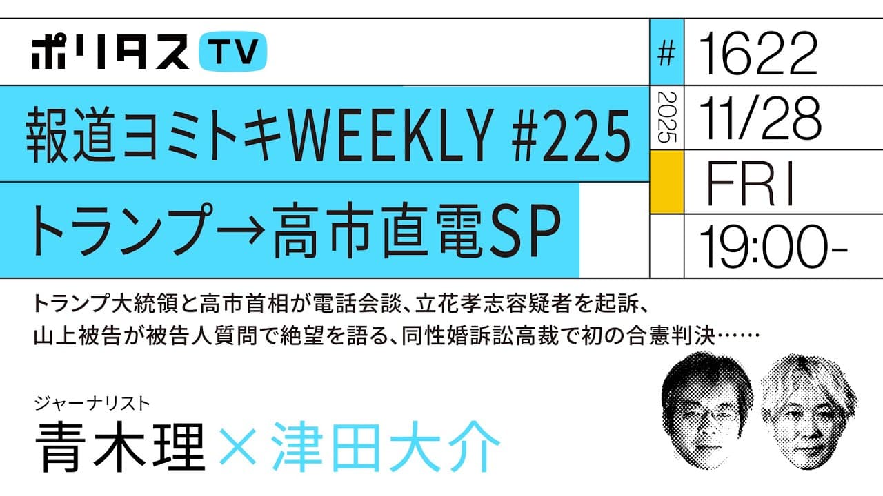 【会員限定】報道ヨミトキWEEKLY #225 ゴールデン(11/28)#ポリタスTV 👉️ https://www.youtube.com/live/CNHGCB1Jgmo?si=fFaHmHsOJkVGZ5SU 会員限定の放送を視聴したい方はメンバーシップ登録をお願いします (下記リンクから会員登録できます) 👉 https://youtube.com/PolitasTV/join 【ポリタスTV 11/28】 1️⃣報道ヨミトキWEEKLY #225 トランプ→高市直電SP 2️⃣トランプ大統領と高市首相が電話会談、立花孝志容疑者を起訴、山上被告が被告人質問で絶望を語る、同性婚訴訟高裁で初の合憲判決…… ジャーナリストの青木理さんと1週間のニュースを振り返ります。 #ポリタスTV 【出演者】 青木理(ジャーナリスト) 津田大介(MC) ■青木理さん新刊『闇の奥』 https://www.amazon.co.jp/dp/430923173X/ https://www.kawade.co.jp/np/isbn/9784309231730/ ■『分断八〇年 韓国民主主義と南北統一の限界』出版記念 特別対談【徐台教×青木理】 https://www.youtube.com/watch?v=dgWDFyBCpTk ■『ニッポンの移民——増え続ける外国人とどう向き合うか』(是川夕) https://www.chikumashobo.co.jp/product/9784480077103/ 山上容疑者のツイートを内容分析|安倍元首相銃撃事件の山上容疑者はツイッターにどのような痕跡を残していたのか。メディア論の観点から内容を分析|ゲスト:伊藤昌亮(8/2)#ポリタスTV https://www.youtube.com/watch?v=hcyrZ8-1BnQ ============================================ ポリタスTVの番組は一週間後の19時まで見逃し配信、それ以降は下記の有料アーカイブサービスにてご視聴ください。1000本以上の過去配信番組(一部ライブ配信番組を除く)がご覧いただけます! 【メンバーシップ加入はコチラから】 👉 https://youtube.com/PolitasTV/join 【ポリタスTV】毎日(日本時間)午後7時より配信中! 多士済々のMC陣が、その時々の時事問題や社会問題、メディア、テクノロジー、文化や芸術などのテーマを解説・深掘りします。