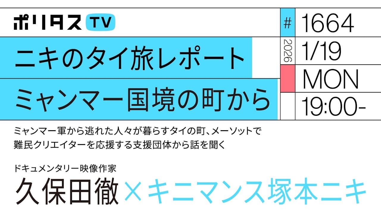 【ポリタスTVのメンバーシップ加入はコチラから】 👉 https://youtube.com/PolitasTV/join 【ポリタスTV 1/19】 1️⃣クーデターから5年目の「イカサマ選挙」 2️⃣弾圧にカメラで抵抗する難民たち 3️⃣謎の白い粉を顔に塗られたニキ ドキュメンタリー映像作家の久保田徹さん @torukubota23 にニキ tsukaniki85 が伺います。#ポリタス #ニキタス Docu Athan ドキュ・アッタン https://www.docuathan.com/ 久保田徹 | Toru Kubota https://www.torukubota.com/ 『境界の抵抗者たち』ミャンマーを追われた人々(ポリタスTV 2024.07.23) https://youtube.com/live/wLgZO61zTBA 【出演】 久保田徹(ドキュメンタリー映像作家) キニマンス塚本ニキ(MC / 翻訳・通訳)@tsukaniki85 ==================== ポリタスTVの番組は一週間後の19時まで見逃し配信、それ以降は下記の有料アーカイブサービスにてご視聴ください。1500本以上の過去配信番組(一部ライブ配信番組を除く)がご覧いただけます! 【ポリタスTVのメンバーシップ加入はコチラから】 👉 https://youtube.com/PolitasTV/join 【ポリタスTV】(日本時間)午後7時より配信中! 多士済々のMC陣が、その時々の時事問題や社会問題、メディア、テクノロジー、文化や芸術などのテーマを解説・深掘りします。