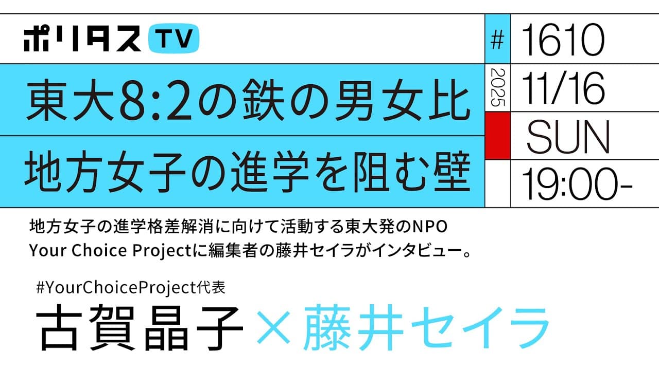 YouTubeで開く■【クラウドファンディング】地方女子が自由に進路選択ができる社会を実現したい! 👉https://camp-fire.jp/projects/889425/view 【ポリタスTVのメンバーシップ加入はコチラから】 👉 https://youtube.com/PolitasTV/join 【ポリタスTV 11/16】 1️⃣地方×性別の二重のハードル 2️⃣東大総長賞を受けた高校生支援 3️⃣進学格差を減らすには何が必要? 地方女子の進学格差解消に向けて活動する東大発のNPO#YourChoiceProject に編集者の藤井セイラがインタビュー。#ポリタスTV 【出演】 古賀晶子(#YourChoiceProject代表) 藤井セイラ(編集者、エッセイスト) ■「なぜ地方女子は東大を目指さないのか」(江森百花、川崎莉音) https://www.amazon.co.jp/dp/4334103995 https://books.kobunsha.com/book/b10125612.html ==================== ポリタスTVの番組は一週間後の19時まで見逃し配信、それ以降は下記の有料アーカイブサービスにてご視聴ください。1500本以上の過去配信番組(一部ライブ配信番組を除く)がご覧いただけます! 【ポリタスTVのメンバーシップ加入はコチラから】 👉 https://youtube.com/PolitasTV/join 【ポリタスTV】(日本時間)午後7時より配信中! 多士済々のMC陣が、その時々の時事問題や社会問題、メディア、テクノロジー、文化や芸術などのテーマを解説・深掘りします。