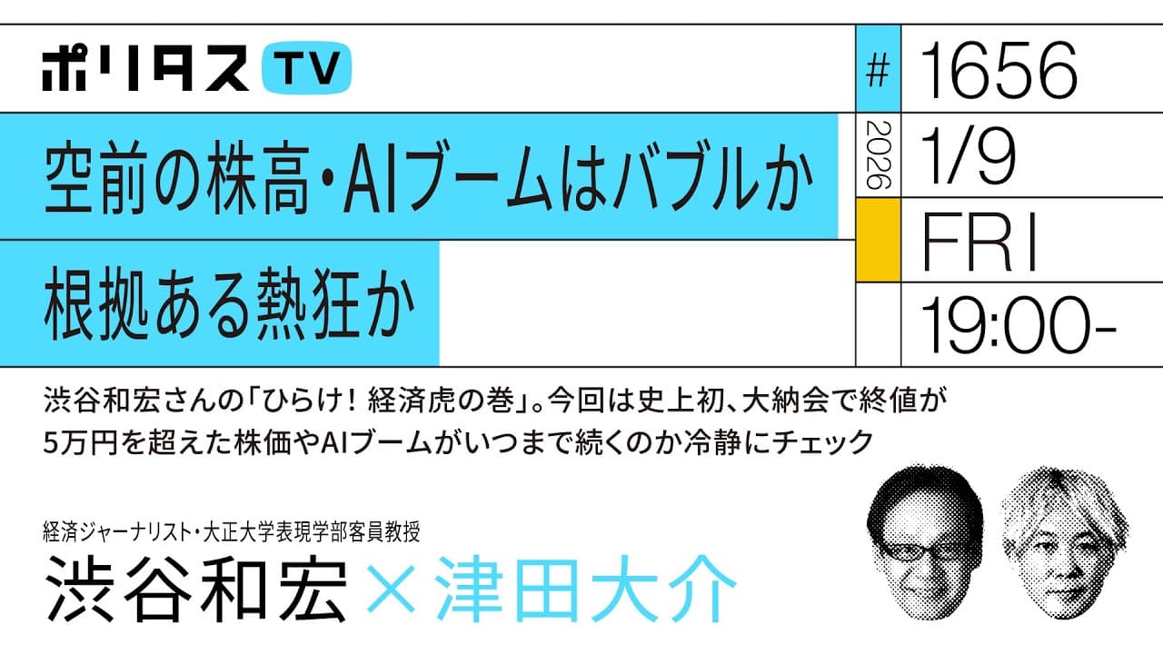 YouTubeで開く【ポリタスTVのメンバーシップ加入はコチラから】 👉 https://youtube.com/PolitasTV/join 【ポリタスTV 1/9】 1️⃣ひらけ! 経済・虎の巻 #51 2️⃣史上初、東京株式市場大納会で終値が5万円を超え 3️⃣空前のAIブームはいつまで続くのか 経済ジャーナリストの渋谷和宏さんに伺います。 #ポリタスTV 【出演】 渋谷和宏(経済ジャーナリスト・大正大学表現学部客員教授) 津田大介(ジャーナリスト/ポリタスTVキャスター) 【ポリタスTV 2025年末 3夜連続プレミアムトーク】 DAY.1| 報道ヨミトキ2025総集編SP@ロフトプラスワン【#クレタス】 DAY.2| 「推し活」の"悪さ"と広告炎上から振り返る2025年 DAY.3| 「子育て」と「仕事/キャリア」の両立はなんでこんなにむずかしいのか? [チケット購入]👉 https://politastv.zaiko.io/item/377415 ※アーカイブ視聴期間:2026年1月12日(月)23時59分までアーカイブは視聴できます ==================== ポリタスTVの番組は一週間後の19時まで見逃し配信、それ以降は下記の有料アーカイブサービスにてご視聴ください。1500本以上の過去配信番組(一部ライブ配信番組を除く)がご覧いただけます! 【ポリタスTVのメンバーシップ加入はコチラから】 👉 https://youtube.com/PolitasTV/join 【ポリタスTV】(日本時間)午後7時より配信中! 多士済々のMC陣が、その時々の時事問題や社会問題、メディア、テクノロジー、文化や芸術などのテーマを解説・深掘りします。