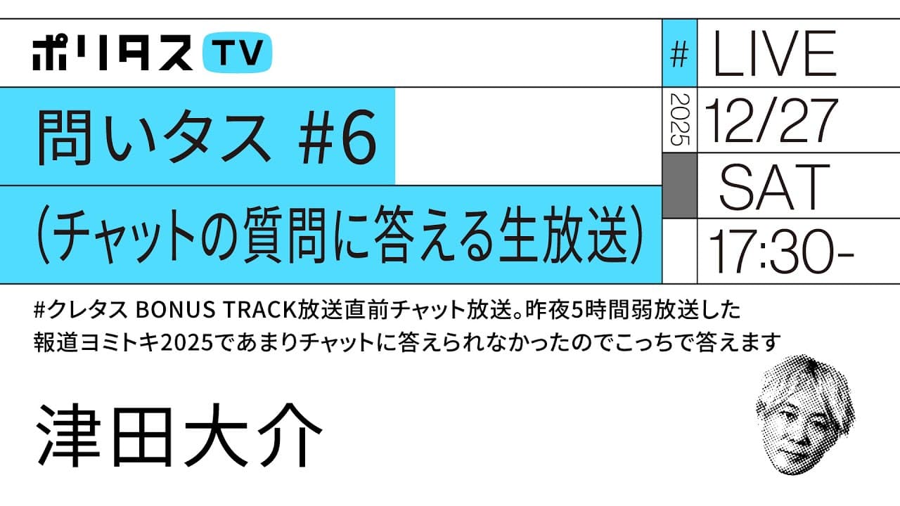 #クレタス BONUS TRACK放送直前チャット放送。昨夜5時間弱放送した報道ヨミトキ2025であまりチャットに答えられなかったのでこっちで答えます 【出演】 津田大介(MC / ポリタスTVキャスター) 【ポリタスTV 2025年末 3夜連続プレミアムトーク】 DAY.1| 12.26 FRI 報道ヨミトキ2025総集編SP@ロフトプラスワン【#クレタス】 DAY.2| 12.27 SAT 「推し活」の"悪さ"と広告炎上から振り返る2025年 DAY.3| 12.28 SUN 「子育て」と「仕事/キャリア」の両立はなんでこんなにむずかしいのか? [チケット購入] 👉 https://politastv.zaiko.io/item/377415 ※アーカイブ視聴期間:2026年1月12日(月)23時59分までアーカイブは視聴できます -------------------------------------------------------- DAY.1 ポリタスTV 報道ヨミトキ2025総集編SP@ロフトプラスワン [日時]12月26日(金)START 19:00 【出演】 青木理(ジャーナリスト),浜田敬子(ジャーナリスト) 宮崎園子(フリーランス記者) 三輪記子(弁護士) 岡田麻沙(ライター、UXライター) 高島鈴(ライター、アナーカ・フェミニスト) 辻田真佐憲(評論家、近現代史研究者) 瀧波ユカリ(漫画家) 北丸雄二(ジャーナリスト) 小川公代(上智大学外国語学部教授) 望月衣塑子(東京新聞記者) 大島育宙(XXCLUB) 津田大介(ジャーナリスト/ポリタスTVキャスター、司会) [配信URL]👉https://zaiko.io/event/377415/stream/183566/163827 -------------------------------------------------------- ●DAY.2 BONUS TRACK#1 「推し活」の"悪さ"と広告炎上から振り返る2025年【配信のみ】 [日時] 12月27日(土)START 19:00 - 【出演】 小林美香(ジェンダー表象研究家) 渡部宏樹(筑波大学人文社会系助教) 中村ホールデン梨華(AD-LAMP代表、広告炎上チェッカー) 町田彩夏(政治コメンテーター) 津田大介(ジャーナリスト/ポリタスTVキャスター、司会) [配信URL]👉 https://zaiko.io/event/377415/stream/183566/163828 -------------------------------------------------------- ●DAY.3 BONUS TRACK#2「子育て」と「仕事/キャリア」の両立はなんでこんなにむずかしいのか?【配信のみ】 [日時] 12月28日(日)START 19:00 - 【出演】 富永京子(立命館大学産業社会学部准教授) 武田俊輔(法政大学社会学部教授) 津田大介(ジャーナリスト/ポリタスTVキャスター、司会) [配信URL]👉 https://zaiko.io/event/377415/stream/183566/163829 【ポリタスTV 2025年末 3夜連続プレミアムトーク】 [チケット購入] 👉 https://politastv.zaiko.io/item/377415 ==================== ◆ ポリタスTV (有限会社ネオローグへの)ドネーション振込先 【銀行振込】 三井住友銀行 神田支店 普通 2027878 ユ)ネオローグ 【PayPal送金】 以下のリンクの送信ボタンからご送金ください。 https://PayPal.me/neologue