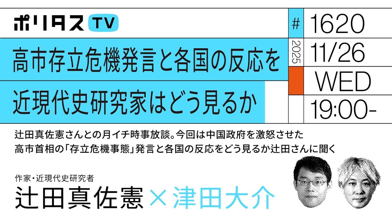 【会員限定】辻田真佐憲×津田大介ゴールデン(11/26) #ポリタスTV 👉https://www.youtube.com/live/aA9lbRzs9-k 今日は会員向けの放送があります。 ご視聴したい方はぜひメンバーシップ登録をお願いします (下記リンクから会員登録できます) 👉 https://youtube.com/PolitasTV/join 【ポリタスTV 11/26】 1️⃣辻田真佐憲×津田大介 月イチ時事放談 2️⃣今回は中国政府を激怒させた高市首相の「存立危機事態」発言と各国の反応 3️⃣それでも軒並み高い政権支持率について 辻田真佐憲さん @reichsneet に伺います。 #ポリタスTV 【出演】 辻田真佐憲(評論家・近現代史研究者) 津田大介(MC / ジャーナリスト / メディア・アクティビスト) ■「あの戦争」は何だったのか (辻田真佐憲 / 講談社現代新書) https://www.amazon.co.jp//dp/4065404991/ https://www.kodansha.co.jp/book/products/0000417459 ==================== ポリタスTVの過去の番組アーカイブは下記の有料プランにご加入の上ご視聴ください。1000本以上の過去配信番組(一部ライブ配信番組を除く)がご覧いただけます! ご加入はこちらから→ https://youtube.com/PolitasTV/join?noapp=1 【ポリタスTV】毎日(日本時間)午後7時より配信中! 多士済々のMC陣が、その時々の時事問題や社会問題、メディア、テクノロジー、文化や芸術などのテーマを解説・深掘りします。