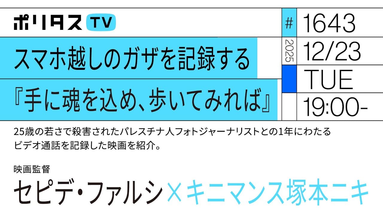 【ポリタスTVのメンバーシップ加入はコチラから】 👉 https://youtube.com/PolitasTV/join 【ポリタスTV 12/23】 1️⃣ファルシ監督へのショートインタビュー 2️⃣映画でガザを変えることはできるのか? 3️⃣ニキのタイ旅ミニレポート 25歳の若さで殺害されたパレスチナ人フォトジャーナリストとの1年にわたるビデオ通話を記録した映画『手に魂を込め、歩いてみれば』を紹介。#ニキタス #ポリタスTV ■映画『手に魂を込め、歩いてみれば』 https://unitedpeople.jp/put/index.html ■『手に魂を込め、歩いてみれば』写真展 https://unitedpeople.jp/put/photo.html 【出演】 セピデ・ファルシ(映画監督) キニマンス塚本ニキ(MC / 翻訳・通訳)@tsukaniki85 【ポリタスTV 2025年末 3夜連続プレミアムトーク】 DAY.1| 12.26 FRI 報道ヨミトキ2025総集編SP@ロフトプラスワン【#クレタス】 DAY.2| 12.27 SAT 「推し活」の"悪さ"と広告炎上から振り返る2025年 DAY.3| 12.28 SUN 「子育て」と「仕事/キャリア」の両立はなんでこんなにむずかしいのか? [チケット購入] 👉 https://politastv.zaiko.io/item/377415 ※アーカイブ視聴期間:2026年1月12日(月)23時59分までアーカイブは視聴できます ==================== ポリタスTVの番組は一週間後の19時まで見逃し配信、それ以降は下記の有料アーカイブサービスにてご視聴ください。1500本以上の過去配信番組(一部ライブ配信番組を除く)がご覧いただけます! 【ポリタスTVのメンバーシップ加入はコチラから】 👉 https://youtube.com/PolitasTV/join 【ポリタスTV】(日本時間)午後7時より配信中! 多士済々のMC陣が、その時々の時事問題や社会問題、メディア、テクノロジー、文化や芸術などのテーマを解説・深掘りします。