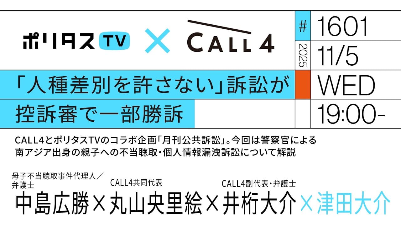 YouTubeで開く■CALL4を支援する! https://www.call4.jp/other.php?key=donation ■「人種差別を許さない」訴訟 ~警察官による母子の不当聴取と個人情報の漏洩~ ~CALL4 https://www.call4.jp/info.php?type=items&id=I0000085 【ポリタスTV 11/5】 1️⃣月刊公共訴訟 #18 2️⃣警察官による南アジア出身の親子への不当聴取・個人情報漏洩訴訟について解説 CALL4とポリタスTVのコラボ企画「月刊公共訴訟」。母子不当聴取事件代理人の中島広勝弁護士、CALL4の丸山央里絵共同代表、井桁大介副代表に伺います。 #ポリタスTV 【出演】 中島広勝(母子不当聴取事件代理人/弁護士) 丸山央里絵(CALL4共同代表) 井桁大介(CALL4副代表・弁護士) 津田大介(MC / ジャーナリスト) ■立候補年齢引き下げ訴訟 ~CALL4 https://www.call4.jp/info.php?type=items&id=I0000117 ■受刑者にも適切な医療を!刑務所医療過誤事件 ~CALL4 https://www.call4.jp/info.php?type=items&id=I0000114 ■CALL4 期日カレンダー https://www.call4.jp/search.php?type=action&run=true ==================== ポリタスTVの番組は一週間後の19時まで見逃し配信、それ以降は下記の有料アーカイブサービスにてご視聴ください。1500本以上の過去配信番組(一部ライブ配信番組を除く)がご覧いただけます! 【ポリタスTVのメンバーシップ加入はコチラから】 👉 https://youtube.com/PolitasTV/join 【ポリタスTV】(日本時間)午後7時より配信中! 多士済々のMC陣が、その時々の時事問題や社会問題、メディア、テクノロジー、文化や芸術などのテーマを解説・深掘りします。