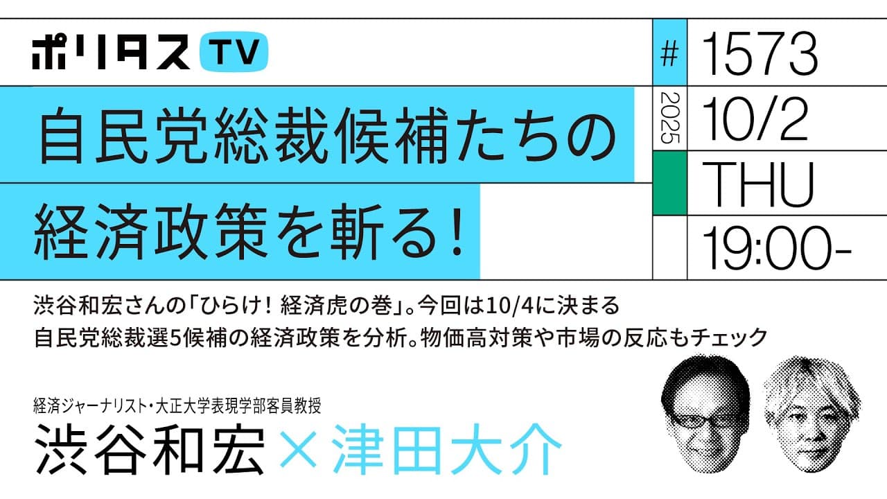 自民党総裁候補たちの経済政策を斬る!|渋谷和宏さんの「ひらけ! 経済虎の巻」。今回は10/4に決まる自民党総裁選5候補の経済政策を分析。物価高対策や市場の反応もチェック(10/2)#ポリタスTV