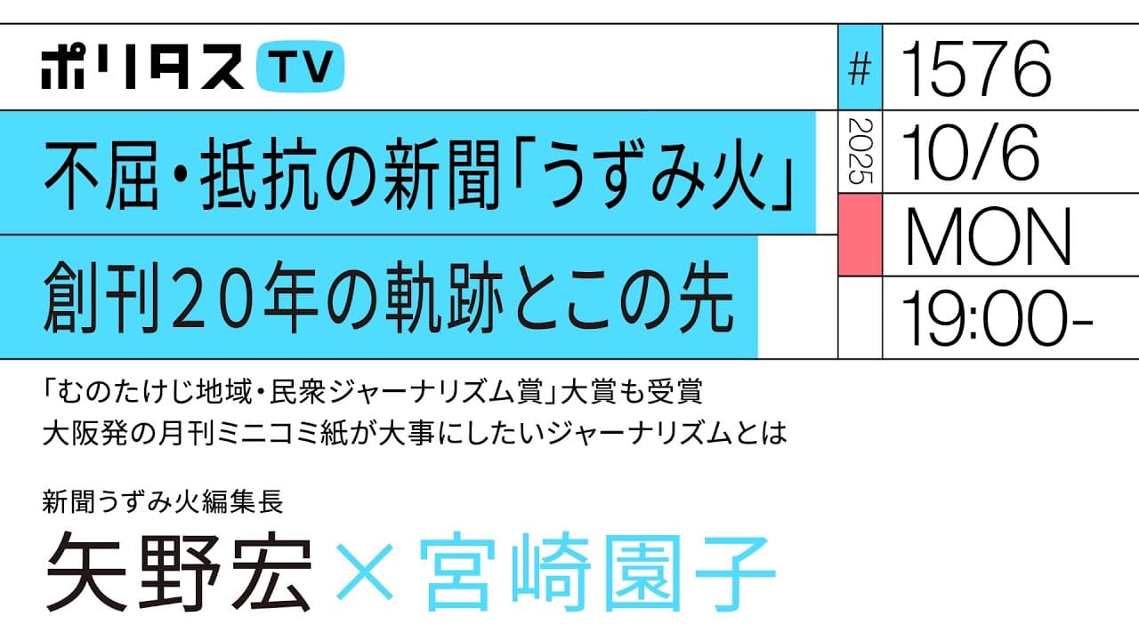 不屈・抵抗の新聞「うずみ火」創刊20年の軌跡とこの先|「むのたけじ地域・民衆ジャーナリズム賞」大賞も受賞 大阪発の月刊ミニコミ紙が大事にしたいジャーナリズムとは|ゲスト:矢野宏(10/6)